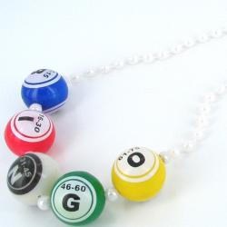 Necklace measures 42 inches and has pearl beads with multi-coloured bingo ball beads (spells out BINGO).
