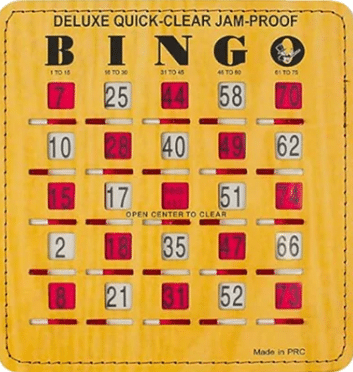 You will not need a dabber or bingo chips with this bingo slide card. Keep the same card for good luck and better odds. Sliding red transparent window allows to cover numbers as they are called, and still see the bolded numbers. Easy reset/ clear shutter feature located on the free space.